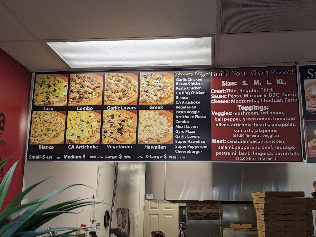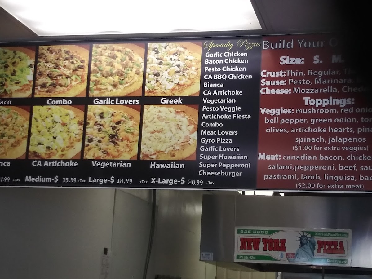 From a reviewer’s perspective, the menu at New York Pizza & Plus impresses with its selection of classic and inventive pizza options offered in multiple sizes with approachable prices. Standout pies include the New York Combo (Small $6.99 / Medium $15.99 / Large $17.99 / X‑Large $19.99), loaded with pepperoni, salami, sausage, ground beef and veggies; the creamy, savory CA Chicken Artichoke (same price range) featuring chicken and artichoke hearts; the zesty The Taco (same prices) topped with seasoned beef and fresh lettuce after baking; the richly garlicky Garlic Lovers (same prices); and the hearty The Boss (same prices) with a mix of meats, pineapple and cheeses. Each pizza combines generous toppings with balanced flavors, and the tiered pricing makes it easy to choose a size that fits your appetite and budget.