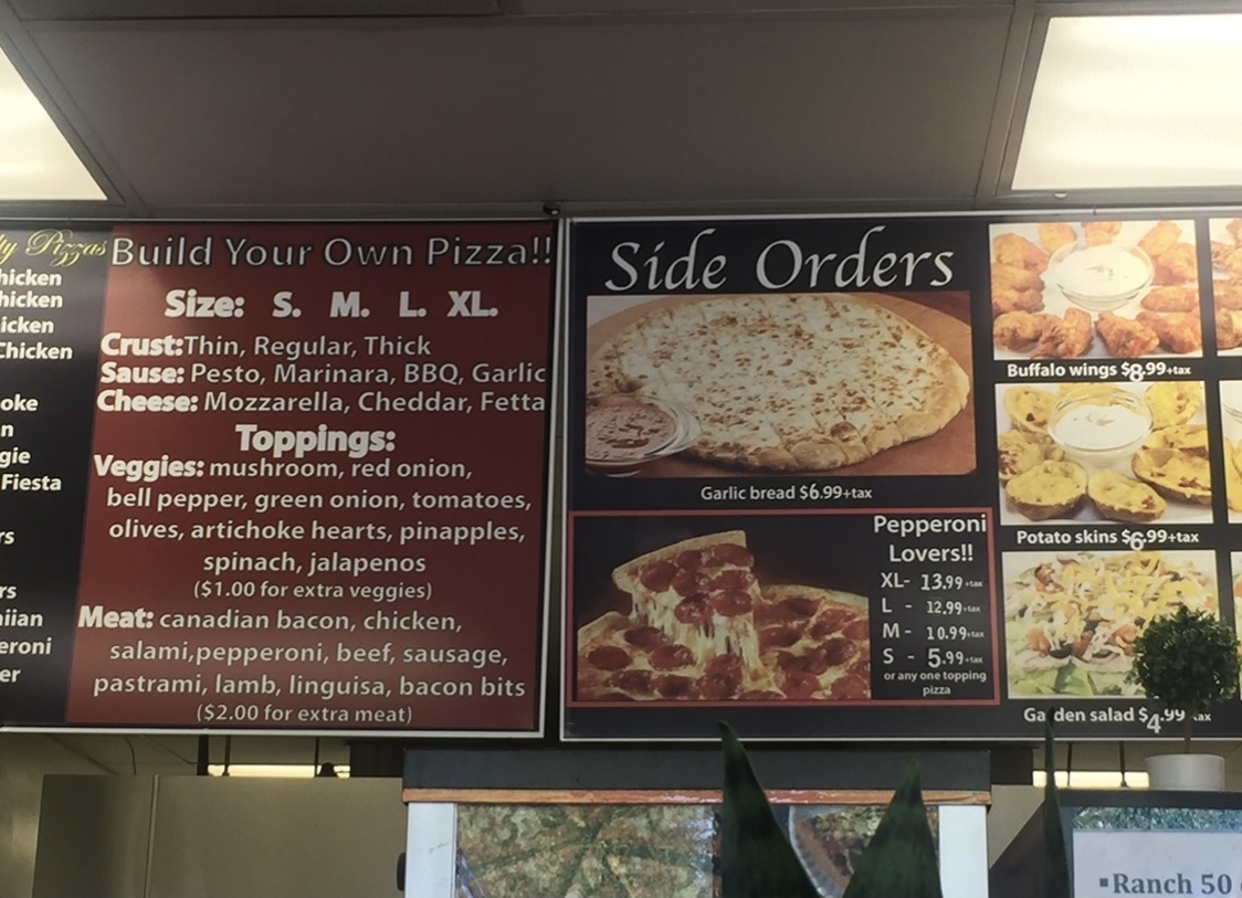 Pizza Toppings: Red Sauce/Marinara Sauce, Mozzarella Cheese, Pepperoni, Salami, Mushrooms, Olives, Green Peppers, Red Onions, Italian Sausage, Ground Beef, Parmesan Cheese